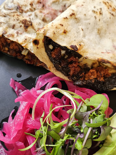 Read moreFrom the patio to the baño, the ambience was elegant, the host was prompt and welcoming, our food was quickly well prepared, and when a large party took our servers attention the management team immediately stepped in to finish coursing us out. This was my first time trying tlayuda and gourmet Mexican cuisine. My server inquired about food allergies, drink preferences, and if I found crickets palatable. I was disappointed to find they didn't have much to offer when it came to alcohol free cocktail options so I had to settle for water. Prior to our foods arrival, someone else's food arrived to our table. Shortly after the mix up was resolved our chicken broth and tortilla soup arrived. Both were deliciously well prepared, seasoned and we were given generous portions. Coursing was timed well so just as we finished our soups, tlayuda and tacos arrived. The tacos were okay, too much cheese for my liking, but the steak inside the tlayuda wasn't thinly sliced as indicated on the menu. Although I wasn't converted from my preference for Mexican street food, I highly recommend it for the Michelin level ambience and plating. However, I could have done without the Pomeranian in a bag barking at the table behind me on the patio. In Mexico it's very common to find dogs out on their own and with their people at coffee shops and restaurants, but this was the only place I experienced it as disruptive. From the city to the countryside every other dog I encountered was so quiet and well mannered I forgot they were there. If you excuse yourself to use the restroom, don't forget your phone like I did. You'll regret not capturing the rest of the restaurant as well as the captivating open air...