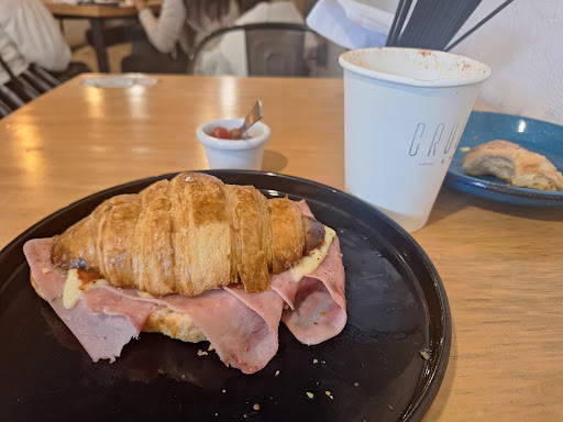 Nos encanta el café con pan y es claro que a Cruco también. Y es que de su barra no sólo salen lattes y capuccinos ideales para consumir con pan, como el chai sucio y el latte con avellana que compartimos aquí, sino que de sus mismos hornos salen piezas pensados para comer con café, como el croissant relleno de higo y el croissant relleno de chocolate que mostramos. Nos encanta esta manera de concebir el café y pan, que afortunadamente es cada vez más abordada. No el café y el pan como entes separados que coinciden, sino más bien como un matrimonio.