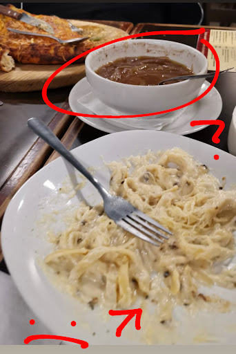 La pasta sabia a pura masa y mantequilla, de alguna manera el parmesano no sabia a a nada tampoco y la sopa de cebolla ni hablar, sabia acida nada agradable y super grasosa.