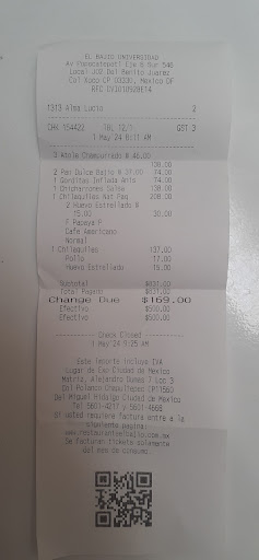 Que mala experiencia. Siendo las ocho de la mañana del primero de mayo un total de tres personas llegamos al restaurante, con mucha hambre y grandes expectativas porque con regularidad desayunamos en el bajío de oasis Coyoacán. El restaurante estaba vacío excepto por dos mesas mas que estaban ocupadas así que tendríamos un gran servicio y realmente no lo fue, iniciaremos esta tragicomedia diciendo que los meseros veían las noticias de nota roja sin mucho interés en mi y mis acompañantes. La mesera se ocupo solo de tomar la orden y cobrar y cuando requerimos algo mas, tuvimos que llamar exageradamente la atención de quien fuese para que nos atendieran. Los alimentos horribles. Mis acompañantes pedirían un champurrado que no bebieron pues estaba quemado, yo pedí un café de olla que estaba frío, nos aventuramos a pedir unas gorditas de piloncillo que juro que eran de un día anterior y pasaron por aceite para calentarlas, mismas que con seguridad nos hicieron daño a los tres, pues es lo único que compartimos, un día después, estamos TODOS enfermos. Después de tan molesta experiencia, mis acompañantes se aventuraron a pedir pan dulce que por cierto en Oasis es delicioso ¿o, no? Que espantoso era el pan, parecía plástico grasiento, espantoso, horrible. Finalmente mis acompañantes pedirían chilaquiles negros y rojos ambos comestibles pero de ninguna forma estaban buenos, refirieron que las tortillas seguro habrían sido fritas un día antes así que en vez de estar doraditas estaban duras. Yo desgraciadamente pedí chicharrón en salsa verde y fue tan malo que lo recuerdo con molestia, la salsa parecía una crema de tomate que ni pica, ni sabe a nada y el chicharrón seguro que era de bolsa corriente de supermercado. Mis acompañantes pidieron una segunda taza de champurrado haciéndole saber al mesero (que no era la nuestra); la experiencia del champurrado anterior para que esta vez les sirviesen algo bebible y no fue así, les sirvieron el mismo champurrado quemado, así que no lo bebió. Pagamos, dejamos el 10 de propina en efectivo después de una discusión por dejarla o no y salimos huyendo de donde jamás hemos de volver. Pero ah! la flojera de no ir cinco minutos mas lejos nos llevo a esta plaza sucia y medio abandonada y restaurante de terror. No vayan. El costo el mismo de cualquier...