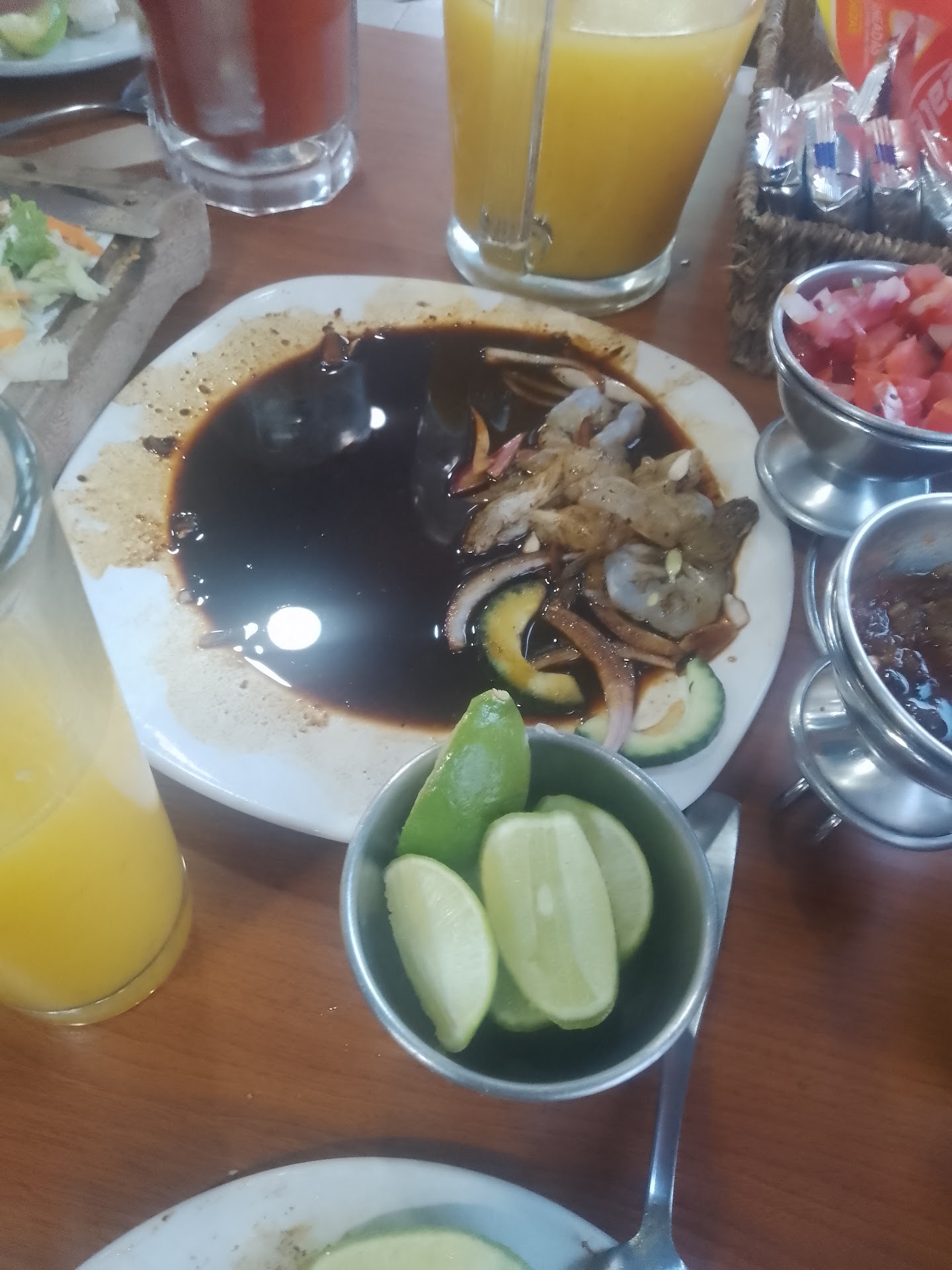 I ordered a Small Shrimp Cocktail which was delicious and for the main dish a Grilled Octopus, It was a little bit overcooked but not too much fortunately, this was complemented with a small salad including a peach dressing and a modest portion of white rise and for the grand finale some Shrimp Patties, which by the way, were Quesdillas instead of Patties and were filled with some kind of pasta accompanied with peppers and onions and two shrimps.