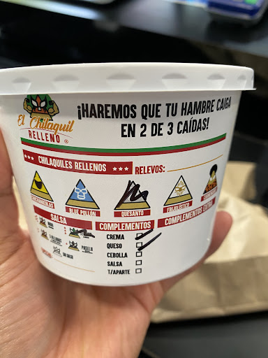 Encontré este local por Uber Eats. Como sé que ya los locales nos venden los chilaquiles a precio de primer mundo, busqué sus reseñas en Google. 4.1 ya es una calificación que te indica que hay un problema con el producto. Leí las reseñas que hablan de que es una porción pequeña y el precio alto por esta. No hice caso (craso error), pero como tampoco podía confiar al 100% del local, pedí unos chilaquiles de 250 gramos (iba a pedir la de 1/2 kg pero temiendo que fuese un fiasco pensé que mejor probaría los de 250 gr para no perder más dinero en caso de que no me gustaran). Son una MINIATURA de porción. De los 250 gramos, el 70% es el peso de la salsa. El vasito es pequeño. Esa porción de chilaquiles (que en Uber Eats está en más de 150 pesos) solo puede ser satisfactoria para un niño de 6 años. Y le pongo 2 estrellas y no 1 porque hasta eso estaban buenos. La salsa sabe bien (te mandan cantidad suficiente para cubrir todos los chilaquiles, y cómo no si 170 gramos de salsa son el peso de los 250 gramos totales, jajajaja). Solo recomiendo estos chilaquiles si vas pasando por el local y quieres probar unos chilaquiles "diferentes" (por estar rellenos). No pidas por Uber Eats pues al elevarse el costo y ver lo que te envían pues no vale la pena el gasto. Y tampoco los compres si tienes mucha hambre, aunque vayas pasando fuera del local. Y para acabarla de amolar NO me enviaron mi cuchara cuando claramente en el pedido se...