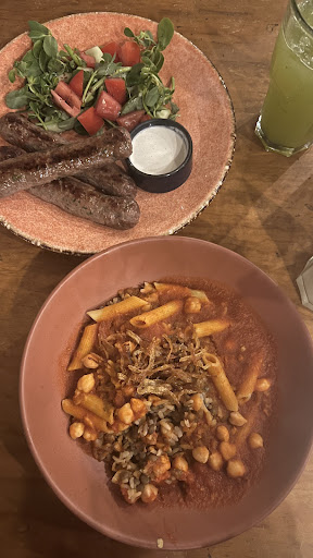 La comida fue riquísima. Primero pedí un plato de lentejas, que no eran nada de otro mundo, pero acompañadas de pan pita realzan su sabor. Luego me trajeron spaghetti árabe, que es uno normal, pero añaden carne de cordero como interpretación de la boloñesa, con sus los perfumes y timbres característicos de las especias orientales. Cómo plato fuerte, el keppa, carne de cordero con piñones y frito en bola, fue una experiencia nueva, además del hummus que me pareció exquisito, acompañado de una ensalada de arúcula con lechuga, tomate y vinagreta. El único "pero" sería que había muchos tallos de la arúcula.