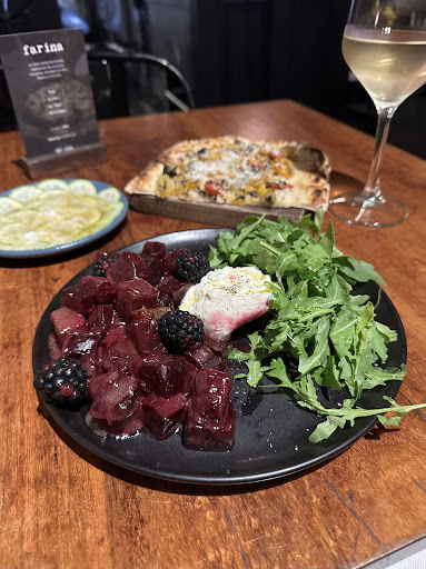 Read moreThere’s a few of these around town, but this is the first one I’ve visited. Popped in on a rainy night to try the pizza. I had the Pavarotti. I’m pretty hard judging pizza, but this was quite good. Soft, fresh, tangy sourdough crust with just enough sauce on the center to be wet but properly baked. Great job on the construction and the baking! I followed with the fig cake and ice cream. Good flavors but a bit dense and dry. After that positive experience, I visited a week later for the salmon. Started with the roasted beet and burrata and they were great, especially with the fresh greens to balance. I was asked if I’d like some focaccia. I assumed it was some small pieces on the house but I was surprised when a healthy portion appeared right out of the oven. That would’ve been a fine and complete dinner, however my salmon was soon to arrive. When it appeared, it was oven baked, skin on. I had been asked how I wanted it cooked and caught off guard, I said medium. It was cooked to order but I should have asked for rare with a sear. No fault of the staff. Nonetheless, it was a good portion and well prepared. Can recommend. No dessert that time! Both visits I had some difficulty matching a wine as either they were out or just limited in types by the glass. That’s the only recommendation I can make is to add a greater variety of wines by the glass. I’m looking forward to trying some other vegetable dishes on the menu. Service was good. There are high tops and regular tables available, along with some limited outside seating. I think they had an English menu, but...