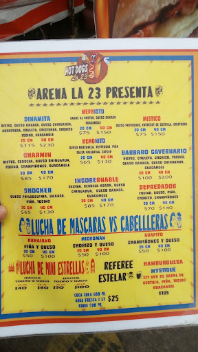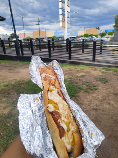 Es un puesto a pie de banqueta, muy organizado en el que puedes saciar tu apetito con Hot dogs de 20 o 40 cm, con ingredientes frescos y de calidad como los son la tradicional salchicha frita en aceite, chorizo, chistorra, arrachera, chuleta, tocino, cecina, costilla, pepperoni, carne al pastor, variedad de quesos como Chihuahua, Oaxaca, Philadelphia, mozzarella o con una deliciosa piña o con champiñones, cuyos nombres hacen referencia a miembros de la Lucha Libre Mexicana pero también con una deliciosa y jugosa hamburguesa de costilla llamada Mystique con los ingredientes tradicionales agregando un sabor muy mexicano con sus rajas toreadas, guacamole o aderezo de chipotle. Sus costos en hot dogs van desde los $40 hasta los $200 de prendiendo de la especialidad y del apetito que tengas y en la hamburguesa $105. Acompáñalos con un jugo, refresco o agua fresca con un valor aproximado de $25. Su empaquetado para llevar conserva excelente tu hot dog. Así que ya sabes si estás cerca de la clínica 23 de IMSS en San Juan de Aragón no dudes en pasar por un hot dog o por tu...