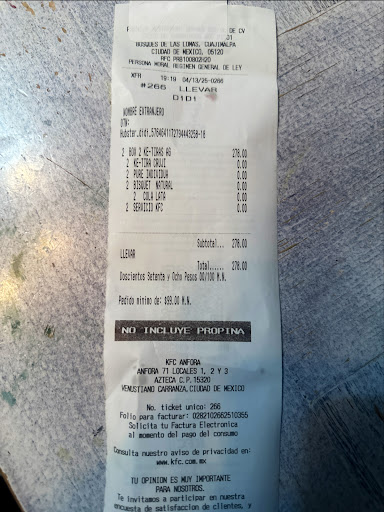 No entregaron el pedido completo por medio de aplicación uber eats, ofertan productos que no tienen sin verificar su disponibilidad y avisar que estará agotado (pedí un paquete de 10 piezas ensalada puré y 4 bisquets mitad 11 chiles y la otra de crujiente más un bisquet extra porque comeríamos 5 personas) hasta el momento de hacer la preparación del producto salen con que van a surtir lo que les da la gana, la solución de la app fue mandar un mensaje para elegir otra cosa y como no acepte lo que ellos querían enviar, se tardaron15 min. más de lo que habían quedado; al llegar el pedido no me mandaron el bisquet extra, la app va a reembolsar en unos días, dejándo sin comer a una persona. Además de que ya no se molestan ni en enviar sobres de mermelada y salsa, ni especifican si se pueden pedir con un costo. Es la última vez que gasto dinero en esta empresa porque dudo que a sus clientes fifis del Sur les den el mismo servicio, pero si nos...
