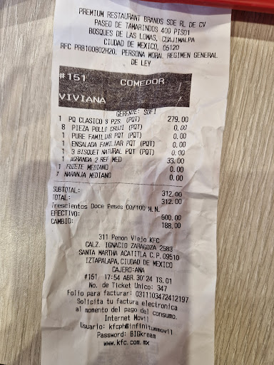 La verdad a mi parecer el personal necesita mayor capacitación principalmente para atender al consumidor, acudí el día de hoy a dos sucursales una ubicada en periférico y eje 5 en la bodega Aurrerá, una sola persona atendiendo caja, tomando pedido, embolsando y entregando, ok quizá faltó personal y tenía que cubrir pero no es escusa para estar mal fajado y haciendo las cosas con una pereza de oso koala o perezoso al subir un árbol, no tener la atención con las personas para pedir paciencia, solamente se volteaba y sin decir nada nos dejaba esperando, en ese momento solo habiamos: dos personas esperando orden una persona delante de mí y dos atrás en fila, para poder llegar para pedir mi orden fue una espera de 15 min aprox y una vez que me tocó pedir el chavo solo se dió la vuelta para realizar las demás tareas, estuve esperando 10 minutos más y ni volteaba para si quiera decir permítame ni entregaba nada ok me desesperé y mejor me traslade a la sucursal kfc de peñón viejo que queda más cerca de su humilde hogar, yo creo que ya la tenía de mala suerte ok llegué directo a la caja afortunadamente al tratar de hacer mi pedido me encuentro a la subgerente y la cajera haciendo cuentas creo yo y no sé si alguna vez llegaron a ver la hora pico dónde aparece el personaje de la Sisi, pues ni más ni menos, ...-permitame tantito .... Si un momentito ... Espera de 5 minutos para que como robots me rezarán el menú, señorita solo quiero 10 piezas de pollo en reserva secreta... Si tenemos en reserva secreta cruji adobado... Cómo lo va a querer? ...- si deme 10 piezas en reserva secreta .... Tenemos los paquetes que le incluyen...bla bla bla .. NO por favor deme 10 piezas en reserva secreta.. algo mas? Si por favor tres ktiras con la salsa a parte por favor.... Tenemos el paquete de dos tiras que le incluye..,.. NO solo tres TIRAS. Bueno al fin me surtieron mi pedido, no sé si a lo mejor el que está mal soy yo pero creo que tuve la paciencia necesaria, no me exalte conté hasta el 10 y todo sea por el hambre jajaja pero si para mí es notorio que les falta un poco más atención a los clientes, mayor amabilidad y agilizar su proceso de surtir los pedidos, saludos y perdón por la crítica pero es para mejorar sin...
