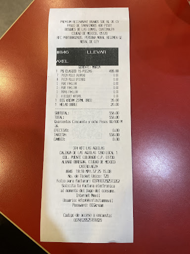 Read moreHoy fui a la sucursal de las águilas, y que pésimo trato de los empleados , es la segunda ve que, me atienden súper mal, son muy groseros, y no te quieren dar lo que tú quieres servilletas, salsa catchup, platos , hoy pedí pollo sin alitas , por qué siempre lo pido así en cualquier otra sucursal y no que quisieron Vender el pollo como yo quería , le comenté que me cobrará adicional si fuera necesario , y no fue posible , decidí irme Sin comprar nada, cabe decir que a la entrada había charcos de agua podrida Hay alguien que ponga orden en esa sucursal , yo compro en otras por ejemplo Santa Fe y no hay punto de comparación en el servicio, ojalá pusieran más atención con el Personal de las Águilas , es una pesadilla . Yo por mi parte...