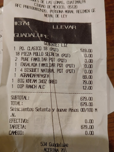 Read moreMal servicio, casi 15 minutos de espera, unas trabajan más y otras bailan la manzanilla, me dijeron va pierna y muslo , y me dieron alita y muslo de pichón; el bisquet más bien parecía piedra casi sin forma y sin sabor, y pequeñito, como los que venden en algunos expendios de pueblito de a peso. La mesa embarrada con caramelo desde hace tiempo, pues ya estaba duro. El dorado del pichón muy bien. La papa muy bien. Los mini gorritos de harina también, imagino que para llenarse de pura harina, el refresco buen sabor, sin mucho dulce como en otros negocios de comida rápida. La atención de recepcionistas muy amables. No volveré a ir, por mentirme en las piezas de pollo, la demora y porque vi que a una persona que dijo mejor deme mi orden para llevar, y discretamente le quitaron una pieza.…. ¿"ROBO CÓMO BUROCRATA CON PEÑA NIETO"? ¿ACASO NO ES SUFICIENTE EL MARGEN DE GANANCIA CÓMO PARA BIRLARLE UNA PIEZA DEL PAQUETE DEL CLIENTE? POBRE CLIENTA. No...