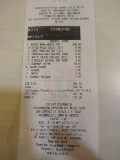 Read more30-04-25, NO HACEN VALIDA LA PROMOCION DEL MIERCOLES, SEGUN POR SER DIA FESTIVO. Y la más reciente, pedido incompleto, en un paquete faltante de piezas de pollo y una papas, desafortunadamente es la única sucursal que tengo "cerca" y como lo compré en el autoservicio, no podía ponerme a contar si las piezas estaban completas en ese momento.