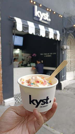 Si te encanta el cereal y el helado, considero que deberías conocer Kyst.dessert, un pequeño lugar, dónde podrás elegir diferentes combinaciones de cereales que ellos ya tienen predeterminados, mezclados con helado de vainilla.