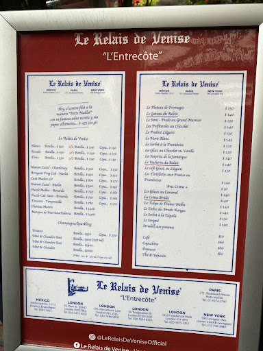 I’m an American visiting Mexico City for the first time… I’ve been to the original L’Entrecote in Paris many times and was surprised to find a chain in CDMX. The restaurant was fairly packed with Polonco’s finest Primadonnas. The hostess had an available seat inside and was happy to accommodate the 2 of us at 6pm. The interiors esthetics and uniforms reminded us of how it was when we visited. The only English speaking server was the captain. She took our order and was nice to relay the message beside our designated server. We ordered our steak Medium Rare and ordered a cheese plate as well. The timing was fast, just like in Paris… Sat down for 5 minutes, placed our order, 5 minutes later the salad and cheese plate arrive and 15 minutes later entrees. The steak arrived black and blue in the center with a nice char around the edges (Rare). We asked the server to re-fire the steak via google translate. Instead of re-firing the entire order they re-cooked the steak and arrived medium well (light brown with a hint of pink in the middle). At that moment, we already knew the service was going downhill… First bite was atrocious. The famous “sauce” tasted more of a hot salsa verde with olive oil with a hint of mustard. The sauce was broken and could clearly see the separation in the sauce (not emulsified). We looked around the restaurant and everyone seemed like they were enjoying the experience, accept for us. Not sure if there was new staff in the kitchen or cooks making food of not “the standard”? They dropped off the dessert menu with only 4 desserts listed… My wife and I were disappointed because the one in Paris had an entire list of desserts to select from. We ended up choosing the chocolate cake (Relias). The table beside us happened to be ordering desserts as well and received a totally different menu (like the one in Paris). You can clearly see the menu because the tables are practically together with no separation. We asked our server and she denied not having that dessert menu available. So, we kindly asked the server to bring us the same dessert the table beside us was having =)