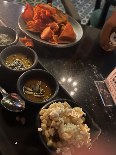 Read moreOn a Monday night there were 4 tables filled and no band. We were oddly seated away from the other diners in a darker area. We wanted to try the Scorpion tasting with the mezcal flight. This was not on the menus and had to ask for it. Luckily my daughter speaks some Spanish because both waiter did not. They brought it out but there was very little instruction excepting dipping the crispy scorpion in the mezcal before drinking. Not the experience we thought. Now for the food. They brought over an iPad because our phones did not translate the QR code. They bring to the table sweet potato chips and salsas. Honestly it was so dark I did not know there were tortilla chips under. The salsas were good. We had ceviche which is large but mainly cucumber. The artichoke was very good. We oddly were given a cast iron pan of melted cheese no seasoning which was an order lost in translation. Tacos we had were the revolution which was interesting and good and the Al pastor which was a big miss. This was not the experience we saw in reviews. Maybe due to a Monday night. We were looking for a festive and fun atmosphere with good food did not experience that at all....