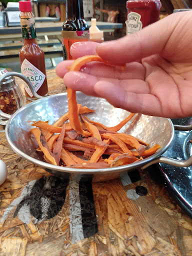 Read moreEl lugar tiene onda, podríamos decir que es propositivo pero la realidad es que es bastante caro y pretencioso para la colonia y la calidad que ofrecen. El lugar es un espacio recuperado, una antigua bodega bien decorada, pero preservando un estilo industrial. Hay tres opciones de "cocina" pizzas y cocina estilo italiana, carnes y cortes al carbón y parrilla y por último mariscos. Lamentablemente todos los platillos fuertes pasan de 100 pesos si tener un buen sabor o con ingredientes de calidad, una pizza mediana bastante mediocre en $170 y unos camotes "fritos", que en realidad estaban espantosamente viejos y aguados, en $40. Vine al lugar por un reportaje de TV y tenía la esperanza de que no fuera un lugar más que gentrificara la colonia obrera y creo que solo es eso, eso sí la atención fue buena y cordial.