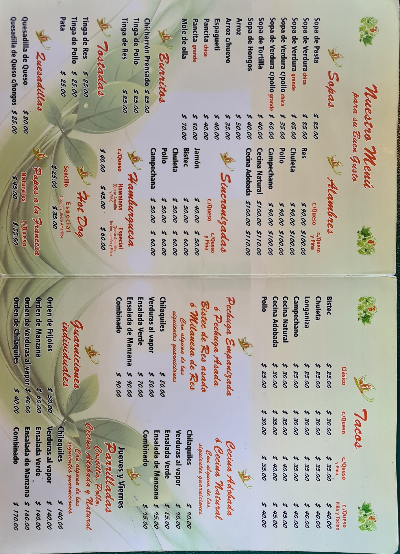 Read moreTenía mucho tiempo que no venía, y lo hice por que de verdad me gusta el sazón de sus alimentos. El día de hoy , asistí con mi madre y hermano , la verdad su sazón rico como siempre, pero, el servicio dejan mucho a desear,., desde que llegamos tardaron en pedirnos la orden, y cuando el mesero se acercó ( un chico de lentes delgado ) al momento de preguntarle por el tipo de sopas su actitud burlona, al preguntarle cual es la sopa de calabaza , (perdón pero no la conozco), creí que era crema y su tono era de burla al decirnos nooo de calabaza , bueno , tardaron horas en la sopa , solo nos trajo un agua y un refresco cuando éramos 3, en fin . Así con varias cosas. Llegó el momento que fui directamente a preguntar por las tortillas que había pedido. Su comida es rica , por favor, no descuiden...