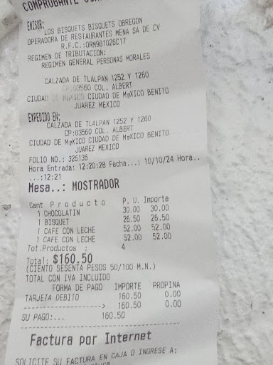 Read moreMi experiencia en ese lugar fue horrible para empezar el mesero Marco Antonio es una persona muy grosera muy pretenciosa desagradable en segundo la limpieza del lugar es horrible tienen muchas cucarachas y sin exagerar tienen muchas cucarachas y se lo digo porque yo personalmente trabajé en ese lugar por un buen tiempo y puedo decirles que la verdad no tienen higiene en los alimentos las cucarachas andan sobre el jitomate el tomate y los frijoles ya cocidos listos para ocuparse para hacer los frijoles refritos o los tomates para hacer las salsas no les preocupa la limpieza para nada todas las ollas y caserolas tienen mucho cochambre están percudidas el techo está hecho un asco si no es porque yo lo limpié en general es un lugar muy sucio no lo parece pero sí lo es tiene muchas cucarachas vi varias veces como del arroz para los consomés les acaban las cucarachas ya muertas de que se metían ahí con el calor se morían también no tienen buena higiene en los manejos de los alimentos la zanahorias cuando están muy apurados ni siquiera se toman el tiempo para pelarlas ni para lavarlas así se ocupan así se da el jugo la naranja y los insumos que ocupan son de muy baja calidad incluso ocupan cosas del 3b digo no son malas cosas porque las ocupo pero si estás vendiendo un producto disque de calidad y de una marca de restaurantes pues reconocida por así decirlo pues vas a ocupar los insumos que te marca los bisquets Obregón la verdad no les recomiendo comer ahí por su...