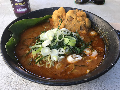 I ordered the Habanero Miso Ramen. It looked really beautiful when it arrived but looks can be deceiving. The first odd thing was that they had created a large mushroom tempura (breaded and deep fried) - but then they put it in the broth which makes no sense. It was also hard to eat because of the size... I would need a knife to cut it.