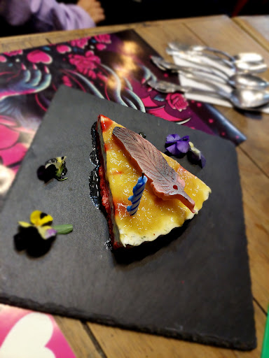 Postre Pastel tentáculo 1/5 - En lo general a mi me encantan los cheesecake mientras conserven la consistencia tipica no importa el complemento con el que vengan. Sin embargo este cheesecake en realidad no lo sería ya qué el centro tiene demasiada grenetina lo que en realidad la hace una gelatina de queso la cobertura también tiene demasiada grenetina y es como goma al masticar, el sabor del cardamomo no le iria mal si es qué la yerba no destacará tanto al final del bocado. el chocolate en hoja si me gustó es semi amargo pero no tiene tentáculo y la base de galleta está ok.