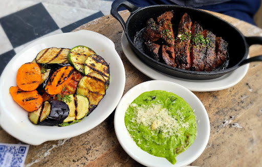 Food: Eggplant chips, agave honey and chile (asked for a dipping sauce) Vegan artichoke soup Rib eye steak with spinach and cream sauce, and added grilled veggies on the side Catch of the day with caper sauce, arugula on top and a slice of potato...