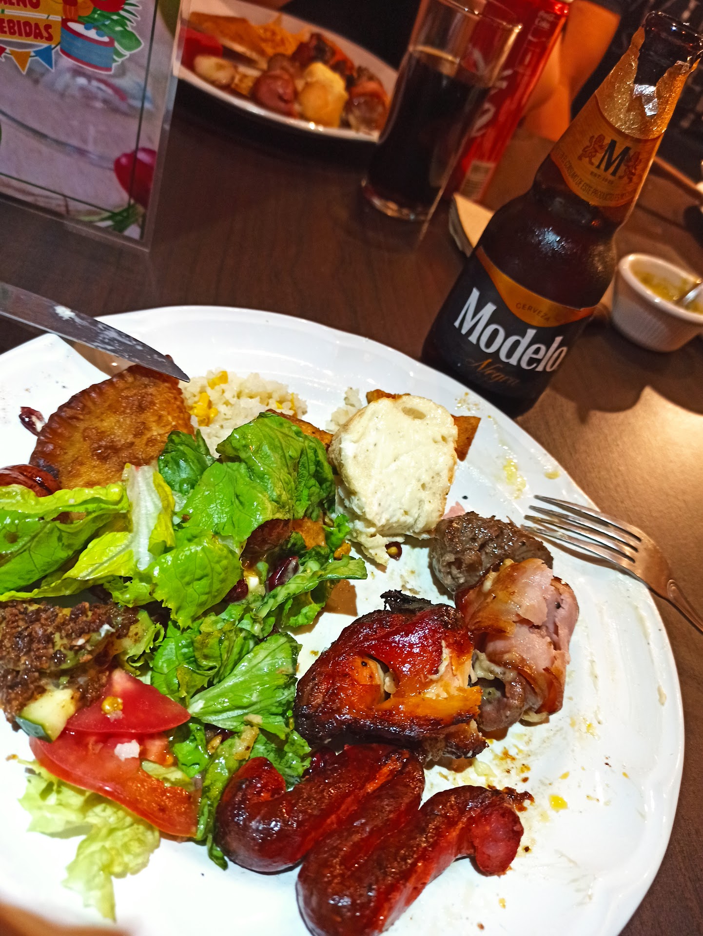 Read moreQuisiera decir lo bueno entonces de las espadas solo me gusto filete mignon, el lomo parmesano, sirlón y arrachera por pasables aunque de repente en un sirlon se pasaron de sal. La picaña la vi pasar 3 veces, la pedí pero nunca pasó a mi mesa el chavo y sólo hay una espada de picaña y atendía de un lado (no se si era su familia o la propina). La ensaladas pues no lo vale. Los meseros amables, el postre de tapioca y arroz con leche aceptables pero no formidables. Fui en sábado hubo una bailarina de samba pasando por las mesas con batucada en vivo que fue lo rescatable. Las empanadas sabían horrible. Hay mejores lugares de espadas brasileñas pagando un poquito más. Definitivamente es el peor lugar al que he ido en cuanto a alimentos, pero el ambiente es tranquilo, poca ventilación pero atienden bien. Excepto por lo de la picaña que ni de chiste me la mandaron ni paso ni nada. No volvería a ir. Pero se ve que hay gente que le gusta la chistorra, el pollo, las costillas, el bolillo con ajo y piña azucarada con canela (que es lo que más ofrecen), si vives en la zona puede que este bien. Pero debe haber mejores lugares...