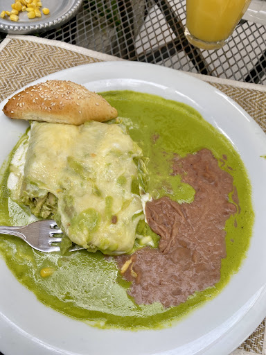 Compartimos los molletes con chorizo y yo me desayuné unas enchiladas verdes. Todo 5/5.