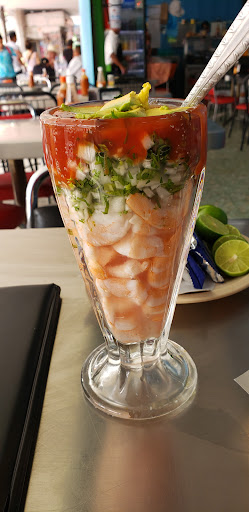 Otra decepción había escuchado que aquí se comía excelentes mariscos y se entendía que en buena porción, si bien el sabor no es malo si no todo lo contrario, las porciones son ridículas,pedí un caldo de camarón con cáscara, me dieron un tazón pequeño con 3 camarones medianos tirandonole a chicos, 3 trocitos de papá y tres trocitos de zanahoria, sin cilantro sin cebollita hasta que se los pedí, por $120 pesos pensé se habían equivocado y le pregunté al mesero confirmando que ese era, digo no esperaba una cazuela pero en ningún lugar me habían servido un caldo de camarón de esa porción, creo q solo en alguna cantina como cortesía con la bebida, éso si con su respectivo bolillo por $10 más, lo demás que comimos en general bien relación cantidad-precio pero el caldo es una mentada de madre, la verdad puro nombre los mariscos de este mercado, me quedo una sensación de rateros y mezquinos, primera y última vez , que bueno que solo hibamos 2 personas que si llevo más quemadota que me doy.... Nada...