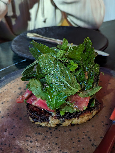 The gordita was intriguing and almost a take on a potato pancake, almost reminiscent of shepherd's pie but infused with Indian spices and bright, herbaceous Mexican flavors. While the greens were a bit cumbersome to wrangle in each bite they added freshness that prevented the dish from feeling too heavy. The onions and peas contributed a pleasant textural contrast to the crispy exterior and smooth, savory potato and meat filling. The lime and greens helped balance each bite, making the dish feel lighter than expected.