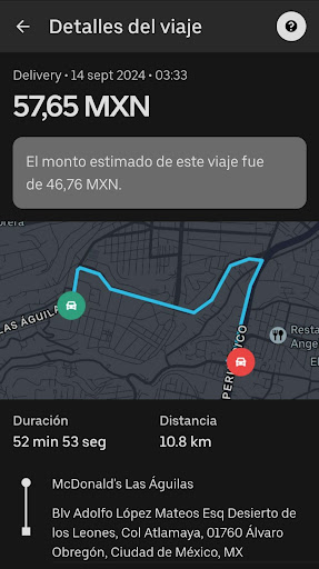 Read moreEl día 14 de septiembre por la madrugada (03:40hr aprox) acudí a recoger un pedido, soy repartidor de uber eats, tuve que esperar cerca de 40 minutos ya que el personal se encontraba en su "hora de comida", esto fue lo que me comentó una señorita de lentes que al parecer es la encargada. Al encontrarme esperando insistentemente en la ventanilla de recolección delivery, procedí a introducirme en las instalaciones, pues noté ruido de personas riendo y hablando fuertemente, de modo que pensé que esta sucursal tenía servicio normal, la puerta se encontraba abierta y me introduje al establecimiento lo que claramente sorprendió a los empleados, quienes nerviosamente me preguntaron "qué quería", por lo que les informé que era el repartidor de uber y que ya tenía mucho rato a fuera esperando sin ser atendido. Quién tomo la palabra fue la joven de lentes diciendo groseramente pero con voz nerviosa, que me saliera del lugar y que después me daría el pedido en cuestión. Yo Francamente molesto u desesperado le contesté que no me iba a salir hasta que me entregara mi pedido, fue la única manera en que me atendió con evidente mala gana. Para constatar los hechos se pueden revisar las cámaras de video del dia y la hora señaladas (sabado 14 de septiembre de 2024, 03:40 hr de la madrugada aprox.) en la imagen que se adjunta se puede corroborar que la duración total del pedido fue casi de 1 hora, cuando máximo tenía que ser...
