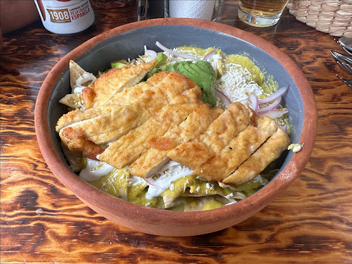 Comida: Los chilaquiles son ricos. Tienen gran variedad de proteínas y complementos y creo que puedes tener una agradable sorpresa comiendo aquí si sueles comer chilaquiles más tradicionales. Si eres mega fan de los chilaquiles y has probado chilaquiles con diferentes proteínas/salsas o tipos de totopos, quizás no vaya a ser algo increíble para ti pero sí aceptable. También ofrecen otros alimentos y, en general, las porciones son grandes y es rico. Ofrecen variedad de salsas con diferentes niveles de picante, pero incluso la más alta no pica. 8.5/10.