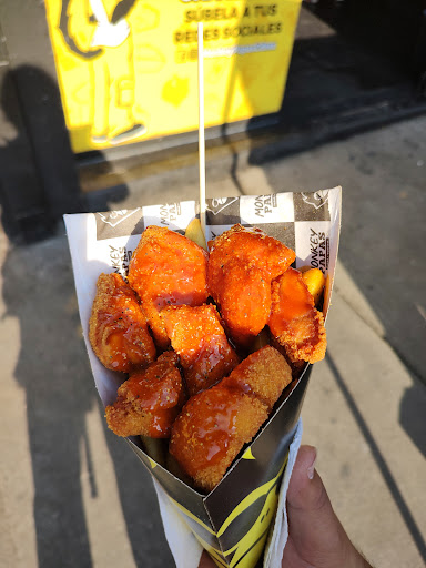 Pero como antojo es un concepto muy divertido. Le echan a un cono de cartón la proporción de papas y boneless que se te antoje, con tu combinación de salsas, y si te inspiras, hay queso fundido, parmesano y bacon bits. Las salsas tienen 3 niveles de picor, desde la inocua blue cheese, hasta la venganza del mango con habanero, formando más de una docena de opciones. Para consentirte, puedes pedir le pongan dos mini dedos de queso al asunto. Entre 90 y 120 pesos, según lo que pidas.