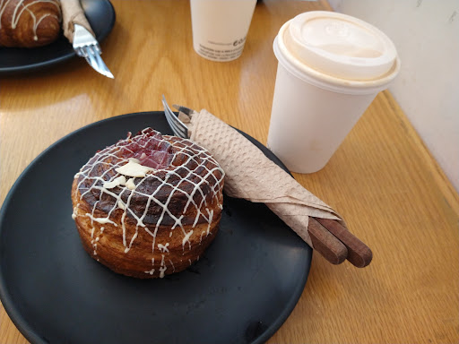 Pedí un cold brew, un taro frappé con leche deslactosada y un morca roll. El cold brew estaba bien, aunque no cumplió del todo mis expectativas. El taro frappé cumplió, y el morca roll me pareció lo mejor de todo: el pan está muy bien logrado, se nota que es uno de sus fuertes.