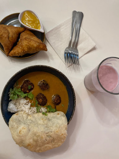 Me sorprendió lo caliente que estaba el curri cuando me lo sirvieron: fue muy reconfortante sin tener una temperatura incómoda para comer. Probé el de tamarindo (Bombay) y me encantó su sabor alternando con el basmati, las croquetas de garbanzo que incluye y el naan con ajo. Fue aún mejor acompañado del lassi de frutos rojos por como contrarresta el sazón del curri. Las samosas están deliciosas y estaban crocantes aunque me comentaron que eran las últimas disponibles del día. El precio de los alimentos me parece más que excelente, sobretodo tratándose del paquete delhi que incluye entrada y bebida con un curri a tu selección.