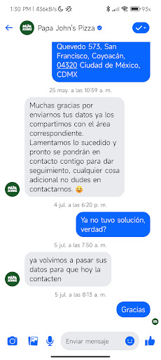 Es una lástima recibir un producto de baja calidad, frío, duro. A esto no nos tenía acostumbrados Papa Johns y mucho menos al trato tan descortés de sus empleados, ya que dijeron que llegaba entre 40 y 50 minutos máximo y no llegó, por lo que yo llamé a la hora de haber hecho el pedido y la persona que me atendió me dijo que el repartidor llevaba tres pedidos, a lo que yo respondí que iba a llegar fría y él me explicó lo del contenedor, pero oh sorpresa! Llegó fría y dura, nuevamente llamo a la tienda de Miguel Angel de Quevedo de la CDMX (a las 23 h) y se portó grosero, diciendo que no es culpable del tráfico y que él solo era pizzero y tenía que contestar el teléfono, pero no era responsable de cómo llegaba el producto a los clientes. Obvio yo le dije que era su trabajo cuidar su nombre y el de la empresa y me dijo que no, por lo que yo le explique que iba a escribir en la página y me dijo que lo hiciera y colgó el teléfono. Es importante decirles que no es la primera vez que la pizza llega con tanto tiempo de retraso y lo hemos dejado pasar, porque el producto no llegaba mal, pero hoy, no se puede...