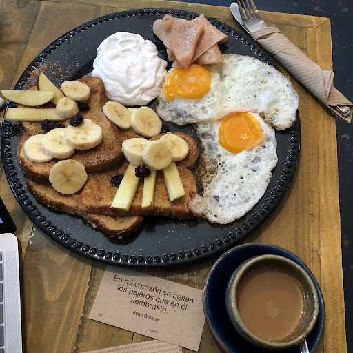 My fav spot in CDMX so far! This cafe is such a hidden gym. I’ve tried a number of things on the menu, and while some dishes have been better than others (the French toast is delicious!), all have left me satisfied with generous portions at great prices. On top of that, I’ll say their espresso is some of the best I’ve had in the city. The staff and owners are so sweet, very positive community vibe. And the way the incorporate poetry into so many aspects of the cafe is something g I really adore, serving dishes with cards with poetry, the poetry murals inside, the menu items filled with literary references, etc. Plus, I LOVE the music they play in there! Super eclectic but all top notch...