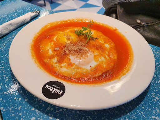 El lugar está muy bonito. Todo el mobiliario es nuevo, hay muchas ventanas y está bastante iluminado. Hay una mesa compartida larga al centro, y varias mesas pequeñas. También hay un buen número de mesas exteriores. El interior está agradable, pero ligeramente ruidoso. Si tienen la mala suerte de que les toque un niño que se la pase gritando, como nos sucedió a nosotros, el ruido sí llega a ser bastante molesto.