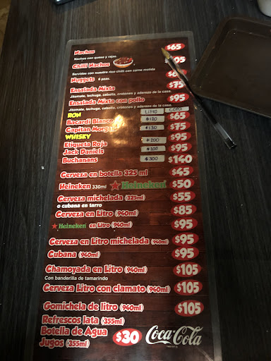 Read moreUna decepción. Había pasado varias veces enfrente, por fin se dio la oportunidad y me decepcionó bastante y me sentí estafada. Para empezar el concepto por fuera sugería algo más rockero y todo el tiempo pusieron música de banda a todo volumen, me ofrecieron unos dedos de queso con bastones de verduras, los pedí y los bastones no los trajeron. En la carta dice que las alitas son con el aderezo que prefieras y solo había ranch y era pura mayonesa, pero alitas búfalo y la salsa tenía habanero aparte de que literal solo eran las puntas, conté solo 3 piezas de la primera falange de 15 alitas que pedí. Pedimos unos hot dogs con chili y el pan estaba viejo. Pedimos nachos con carne y solo era un vasito de carne por el que cobran $50 pesos más. No regreso ni lo recomiendo...
