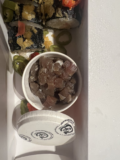 El crispy honey chicken llegó crudo, con una textura aguada, y el pollo en su interior claramente no estaba bien cocido. Del spicy dragon roll, el atún que venía en un botecito estaba en mal estado, con un olor muy desagradable y un color negro, lo que indica que no era apto para el consumo. Además, el resto de la comida presentaba una mala preparación o cocción, lo que la hacía imposible de comer. El único platillo no parecía que llevaba días sin refrigerar y con una cocción apenas comestible fue el "Shrimp with Candied Walnuts". Incluso el jengibre con el que acompañan sus rollos tenía un mal olor y todos sus capeados crudos.