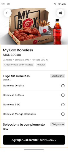Insuficiente. Acabo de realizar un pedido por Uber Eats en esta sucursal. La sucursal mandó el pedido incompleto. Hablando de los boneless, envió 4 piezas y un pedazo de otra. Además el sabor de los boneless no fue el que solicité.