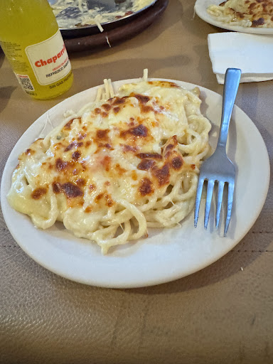 Las pizzas están deliciosas. Buena proporción, masa delgada sin ser escasa, bien horneadas, con el queso en su punto. También probé el espagueti al burro y me encantó; bien servido, con buen sabor y ese toque casero que se agradece. Otro detalle que me sorprendió gratamente fue encontrar refrescos Chaparrita, ¡un golpe directo a la nostalgia! Tuve que pedir uno, y sí, sabe a infancia.