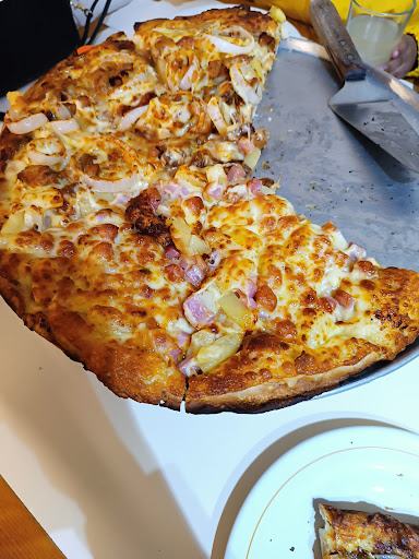 Nos entregaron la pizza y bueno si era GRANDE, estaba muy bien preparada, la masa estaba rica, el queso estaba muy rico, los pimientos en su punto, el tocino frito, se podía sentí el sabor del jamón y del lomo canadiense. Es decir TODO.