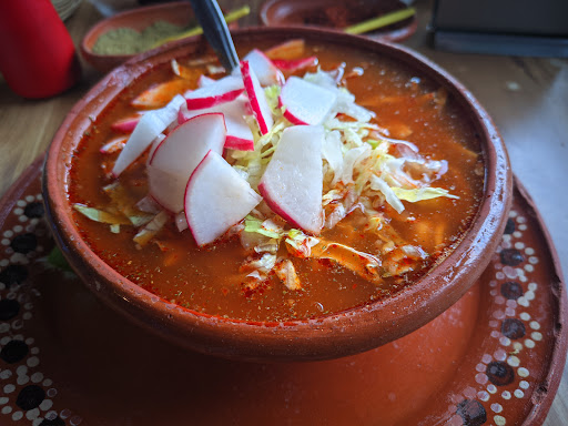 Sinceramente, es un lugar más cómo muchos en esta enorme ciudad. Te ofrece pozole blanco y rojo. En esta ocasión probamos el rojo, aunque en lo personal hubiera preferido el blanco. Lo cual al pedirlo la señora dijo que le faltaba muchísimo. Nos sirvieron, nos sentamos a comer y 10 minutos después llegaron 2 personas a quienes les ofrecieron blanco y rojo y optaron por el blanco. Cómo recomendación. Ofrezca la espera de 10 minutos, no pasa nada, la gente puede entender y esperar. Pero bueno, a lo que vinimos. El costo $100 plato grande un poco más caro de lo normal, actualmente ronda en los $70 a los $90. El tamaño del plato bastante grande. El contenido de carne muy aceptable, aunque no tenía sal. El maíz con buen sabor. El caldo muy simple para un pozole rojo. Las tostadas, pequeñas pero con mucho sabor, muy buenas. Su salsa de árbol con vinagre, exageradamente con vinagre. El chile piquín. Muy muy picante. Eso es bueno, si buscas algo picante para acompañar un pozole. Lechuga, rábano, cebolla, muy bien servido. Limones muy X solo te ofrecen 1 por plato. La verdad por el costo podrían ofrecer algo más. Mínimo crema para las tostadas, o incluso oferta de venta como en muchas otras pozolerias.
