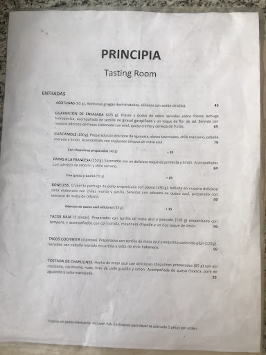 Read more¡Impecable! Cerveza y comida de primera. La cerveza de la casa (Principa) es muy buena y sumamente accesible; la selección de las demás líneas de barril y botellas es muy buena también. La comida absolutamente exquisita, porciones pequeñas. La presentación de los alimento y bebidas altamente estética. Vasos y copas limpios y estandarizados, con la marca del lugar y la línea para indicar la cantidad servida. Definitivamente lo mejor de este lugar es su atención al detalle: portavasos específicos para diferentes tipos de bebida, cristalería Iimpia, atención de primera... Ya que es un lugar joven espero que logren mantener este nivel de servicio y presentación, pues este tiende a decaer después del primer año. Lo único que me quedó a deber fue la tabla de quesos. No sé si fue la selección, la calidad de los quesos, la falta de sofisticación de mi paladar, o todas las anteriores, pero me pareció un tanto insípida y como que no tenía una buena armonía de sabores. Recomendaria ordenar mejor los tacos de ribeye, los sopes de camarón y las flores de calabaza. No se vayan sin probar la Hazy...