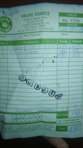 Ya sentados, nos atendieron y tardaron otros 5 minutos en servirnos el pulque. Cuando íbamos a medio tarro la mesera nos abordó para decirnos que teníamos que consumir alimentos con nuestra bebida (eso no pasa ni en otras pulquerías ni en otras sucursales de Vacas Verdes, con pandemia y todo), cosa que me molestó, porque eso se dice al momento de entrar, y ahí uno ya ve qué onda, porque si tengo que consumir algo de la carta, pues ya no me conviene el lunes de 2x1, único atractivo del lugar.