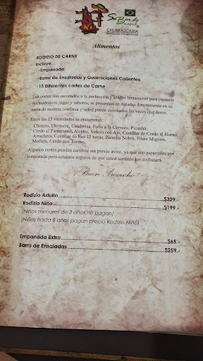 Read moreEl restaurante tiene instalaciones bonitas, puedes llevar niños pero, no hay juegos o espacio realmente para ellos. Los cortes que te llevan en las espadas son en su mayoría de carne de cerdo. No es un restaurante de cortes de carne sino de espadas Brasileiras, entonces en ese caso cumple con ese estándar. Sí es tú cumpleaños y vas con un grupo de personas no te cobran el tenedor del cumpleañero, sólo que no me dieron pastel porque me dijeron que era o el tenedor o el pastelito de cumpleaños. La verdad, no me gustó tanto, tardaban en llegar las espadas, lo que ofrecían de carne era casi siempre las mismas espadas y si querías algo diferente como picaña, tenías que pedirla expresamente. La arrachera era de cerdo... Al inicio lo primero que te traen a tu mesa y te ponen en el plato es una empanada de elote con queso, un pan pequeño frito y cebolla capeada frita según de cortesía, aunque pareciera que es para que te vayas llenando rápidamente y no comas tanta carne. (Digo, de cortesía? Si es tenedor libre, tú podrías tomarlo de la barra de ensaladas si lo quisieras) Pedimos un postre al inicio y no pudieron traerlo aún considerando que se cobraba aparte, decían que era...