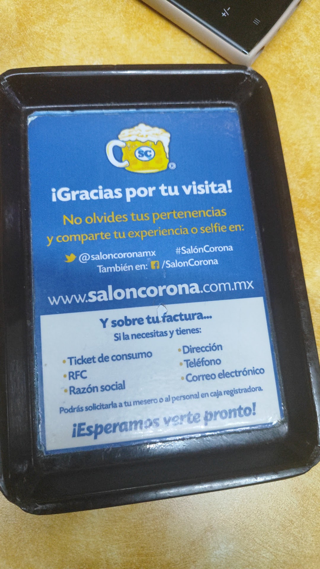 Read moreSus quesadillas mejoraron muchísimo. Una buena porción de buen queso, con su raja de poblano, en una tortilla suavecita y esponjada o tostada. Allí tú eliges. El mole verde con pollo muy sabrosos, así como el adobo. Un picadillo sabroso y bien sazonado. Las salsas muy sabrosas. Con el picorcito agradable, sin que te arranquen la lengua. Lo único que definitivamente me sorprendió fue sus cervezas con clamato. Estas parecían agua. Estaban como rebajadas, como si les hubiesen agregado agua para hacerlas rendir. Siendo SALON CORONA esperas que mantengan la calidad de la cerveza pero algo extraño sucede. Terminamos pidiendo sidral embotellado porque de CERVEZA sólo tenía el nombre y realmente no sé a qué se deba. Será que la CORONA Ahora surte barriles de electopura con un toque de cerveza? Será que la están rebajando? Acaso sería una falla de esas que de pronto se dan en cualquier lado? Por esa razón doy 3 estrellas. Si llegan a cambiar el nombre a SALON ELECTROPURA a lo mejor también les doy 3 estrellas por vender agua contaminada con un...