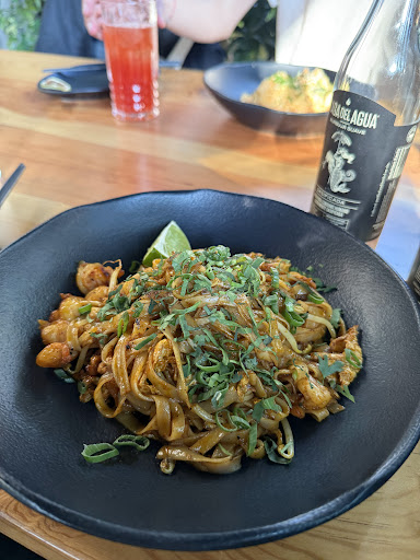 Upon arrival, we were handed menus, but our server immediately started pushing for us to order alcoholic drinks, which felt unnecessary. A positive note was that he asked about allergies, and my request for no peanuts in the pad thai was noted. The food and drinks arrived promptly, and while the pad thai had a good portion size and looked appealing, the taste fell flat. It was lukewarm and just average overall (6.5/10).