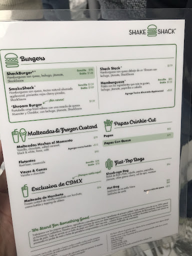 Overpriced fast food burgers. Portions were quite small for the prices as all shake shacks so I guess you only visit once in a while because the beef patty is pretty tasty. Drinks were good, especially the half and half. Hot dogs were ok, would not recommend them; fries were good. The chocolate ice cream with chocolate chips and “tamal” was not great, too sweet and too much chocolate. The waiting time was not terrible (25 minutes) and they were very organized to assign tables. The venue is probably a bit bigger than the one in Reforma. Overall, be ready to pay a lot extra for...