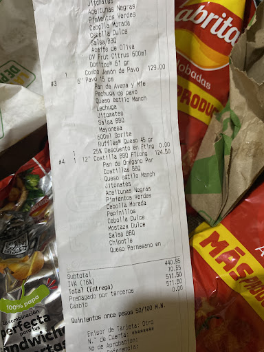 Read moreLamentablemente estás franquicias su calidad depende del personal contratado justo el día 01 de julio de 2023 el personal no sigue bien la capacitación para la preparación de los sandwich amontonan los ingredientes y no los sirven de forma distribuida. Solo sería mi observación hasta ese día y repito que esto depende del personal porque ya te ido anteriormente a esa sucursal y me han tocado chicos en la barra que preparan super bien los alimentos supongo tienen el típico jefe que hostiga al buen empleado orillandolo a qué se vaya y se quedan los...