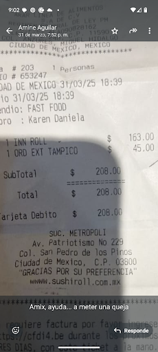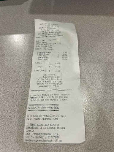 Read moreLlevo años de ir a ese sushi roll, y me gustaba. Actualmente cada vez me gusta menos ir, por que si quiero pedir el servicio directo en la caja y no requerir de algún mesero que me lo lleve a la mesa como que se enojan, y también el que te cobra se enoja por que no agregas propina al servicio comprándolo en mostrador. Ya pasando las caras que te hacen, atienden mas rápido a alguien que si quiso que lo atendiera un mesero y el sushi sabe mejor, como que te castigan dándote el sushi mas feo. Pedí un rollo caliente y me lo dieron todo frío y el aguacate duro. Si siguen así ya mejor iré al nuevo sushi que abrieron en metrópoli o a Mr sushi.. es una lástima que si quieres no pagar servicio de mesero lo...