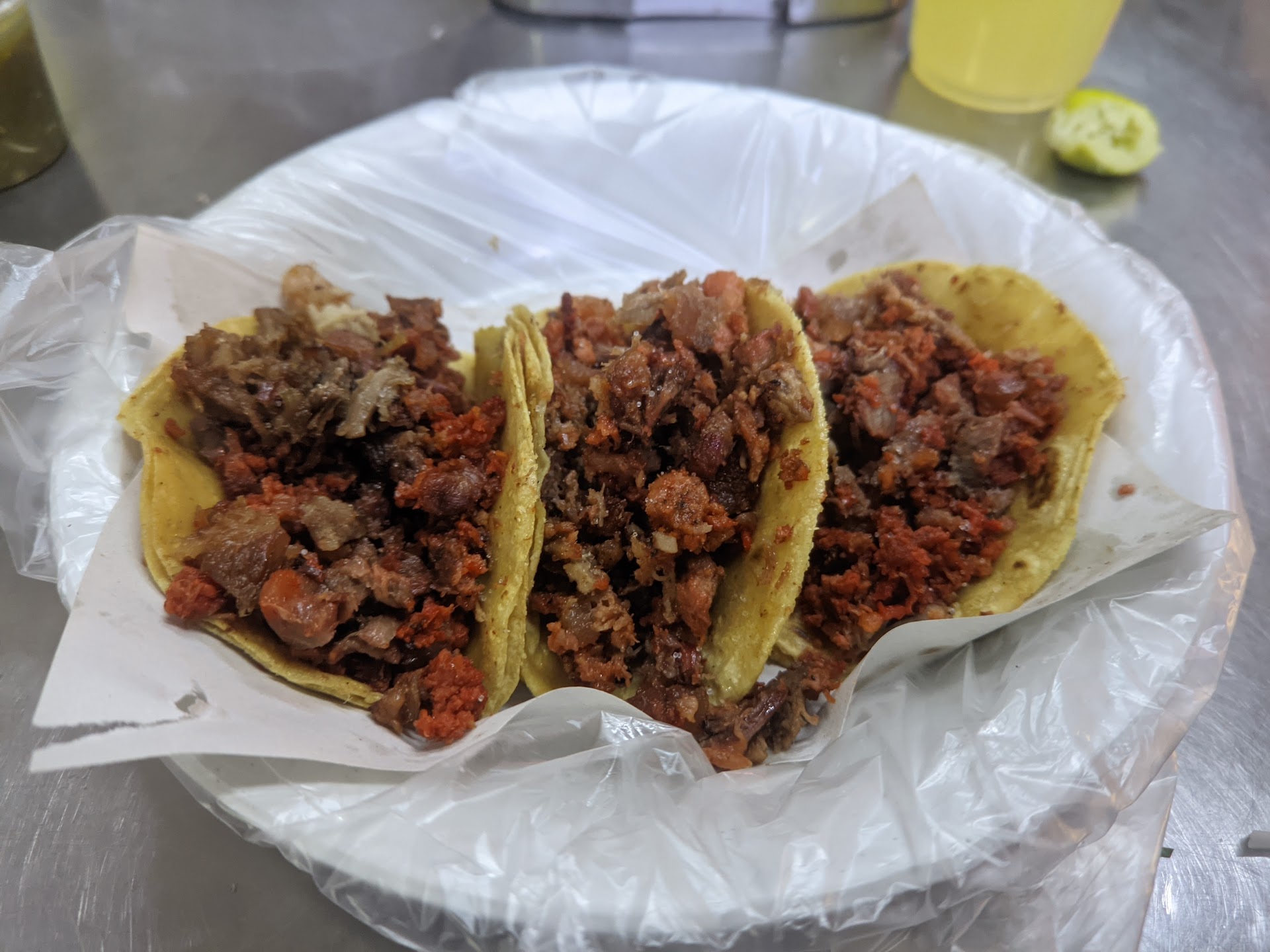 Actualizo mi opinión. Siguen estando muy buenos los de tripa y lengua. Los de pastor les faltó un poco de sabor. Leyendo las opiniones recientes tanto a favor como en contra. Coincido en varios hechos: han reducido la cantidad de salsa, cebollas y nopales que te dan, pero como no han aumentado de precio notablemente tienen que reducir algunos acompañamientos de los tacos (cebollas, nopales y salsas) lo que puede verse como una cantidad inapropiada para algunos, pero como observé que otro comensal pidió más salsa y no hubo mayor problema para que se la dieran, estimo que no es algo grave o no debiera serlo si consumes una buena cantidad y no esperas que te den una cantidad fuerte de estos. En contrapartida pudieran aumentar el precio, y poner sobre la mesa más salsa, nopales y cebollitas. No le pongo 5 estrellas porque la mesa no fue limpiada con esmero, tenía un punto pegajoso y por el sabor del taco al pastor que no merece 5 estrellas. Por lo demás muy sabrosos, como dije, los de tripa...